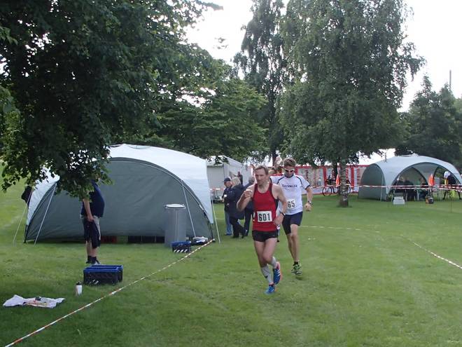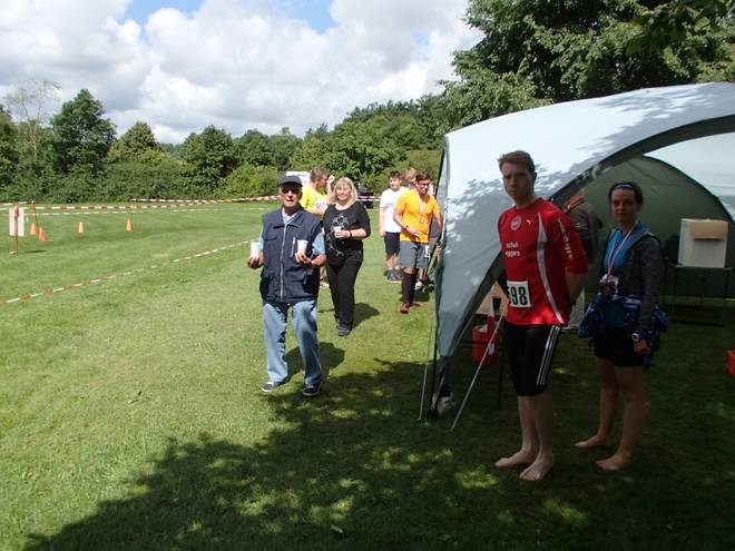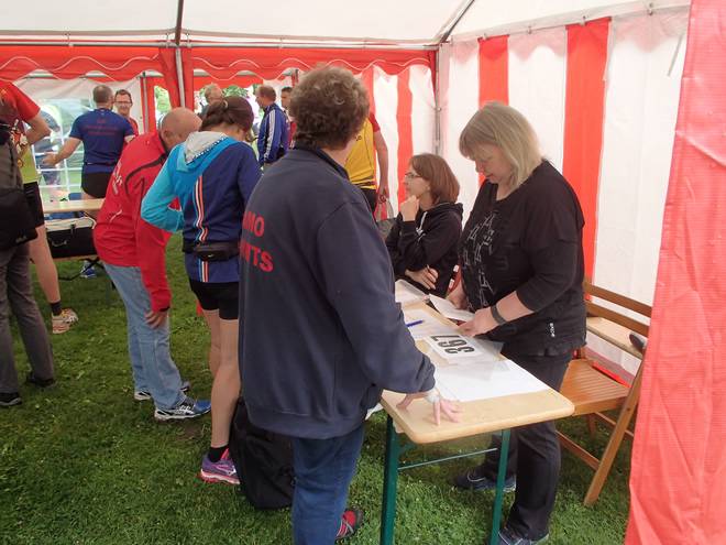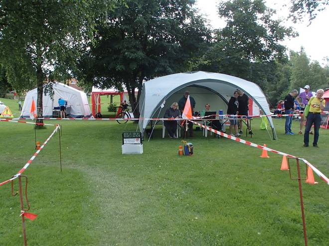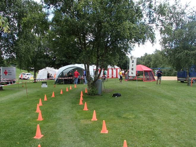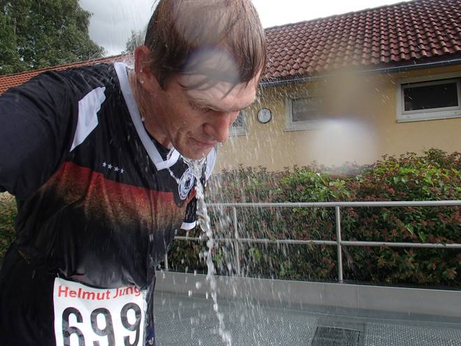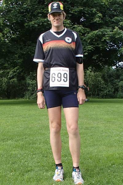 Runde 9 12.32 Uhr / Km 38,0 Nach 22:39 Minuten in der Runde 8 brauchte ich 22:55 Minuten für die Runde 9. Runde 9 dauerte aber nur so lange, weil ich noch schnell ins Zelt lief, um mir etwas mehr Dekoration zu meinem Trikot aus meiner Tasche holte. |