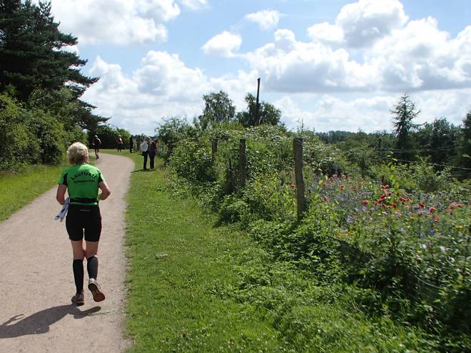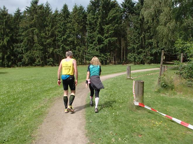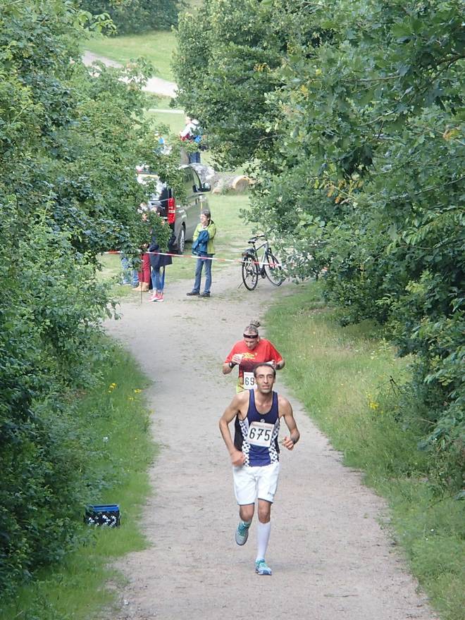 Runde 6 11.07 Uhr / Km 21,9 Wieder Überrundungen. Da die schnellen Halbmarathonies längst geduscht auf dem Heimweg waren, mußten das jetzt Marathonläufer sein. |