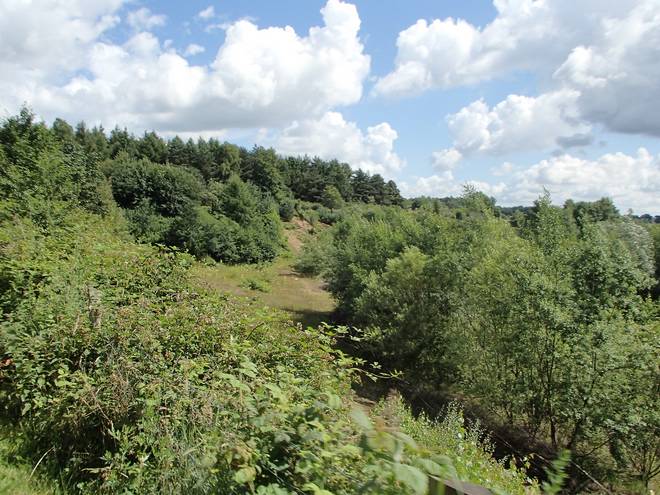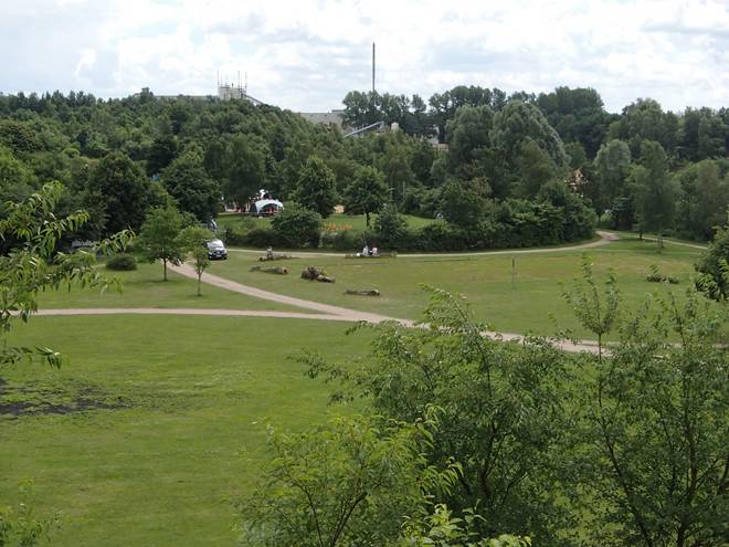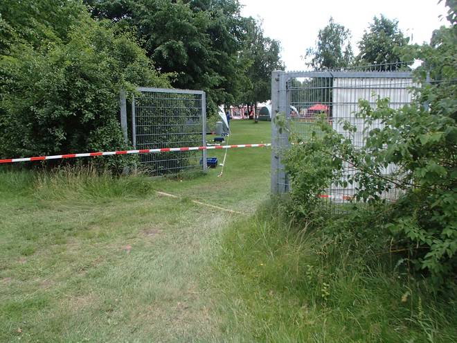 Runde 10 12.37 Uhr / Km 38,6 Blick von oben auf das Start- und Zielgelände (hinter dem Gebüsch-Wall). Das ist das Gegenfoto von dem Bild oben 11.24 Uhr. |