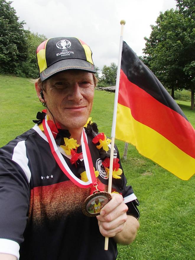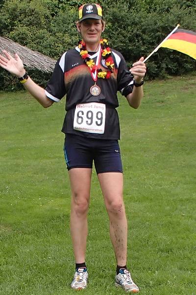 Runde 10 12.34 Uhr / Km 38,1 Ab ging es in die letzte Runde. Nun mit Deutschland-Fahne und Blumenkranz bewaffnet raste ich ganz deutlich unter die Vier-Stunden-Marke. |