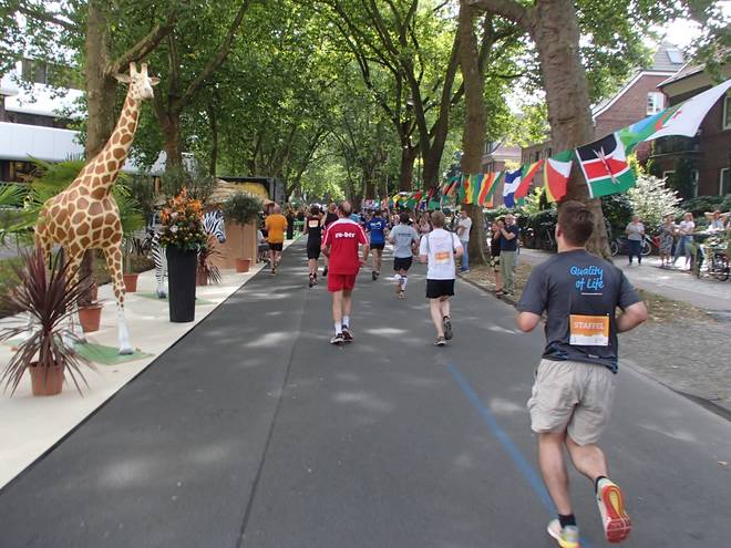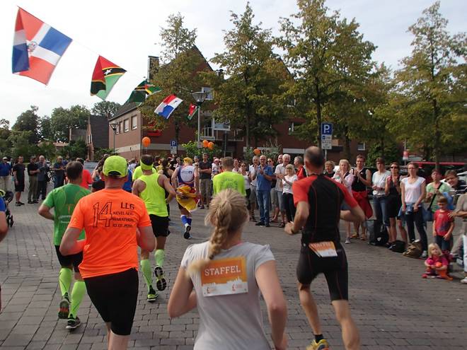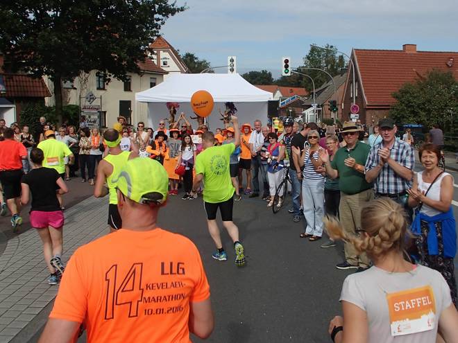 Diekmannstraße 12.06 Uhr - Km 32,8 Jetzt wurde es plötzlich eng auf der Straße. Völlig unerwartet rannte ich in eine Gruppe von Hospiz-Läufern hinein. Da kamen nun zu den Staffeln und den Marathonläufern noch hinzu. |