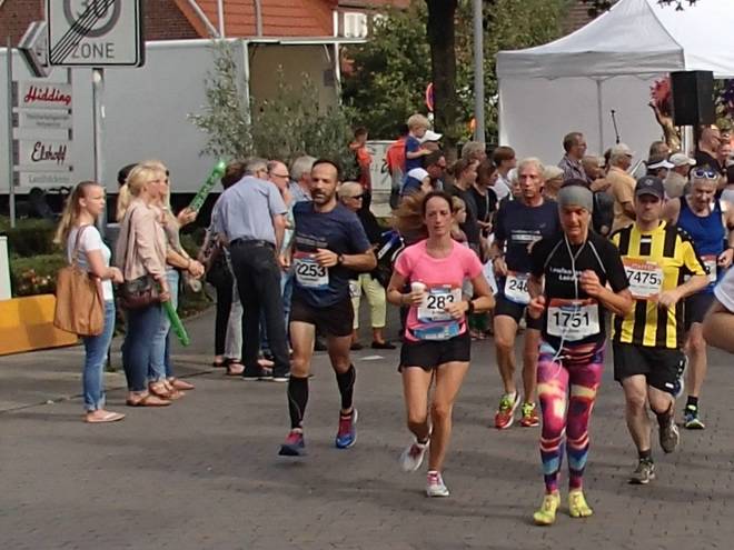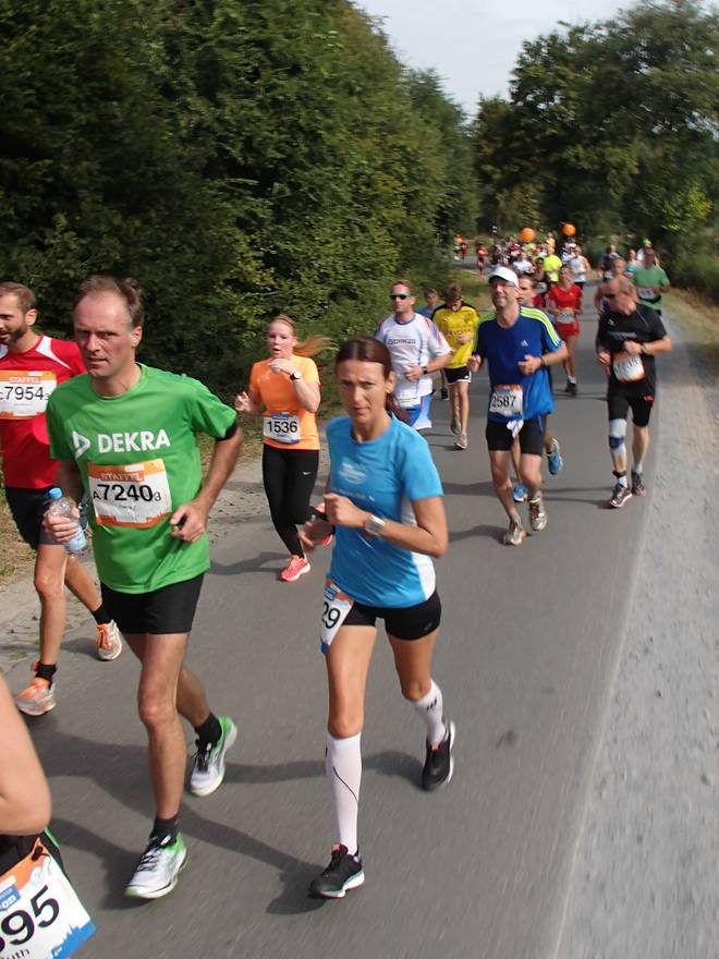 Twerenfeldweg 11.35 Uhr - Km 27,2 Die Dame hier in Blau kannte ich schon vom Marathon auf Kaltehofe (31. Juli 2016). Sie guckt hier zwar, reagierte aber nicht. Muß ja auch nicht sein. |