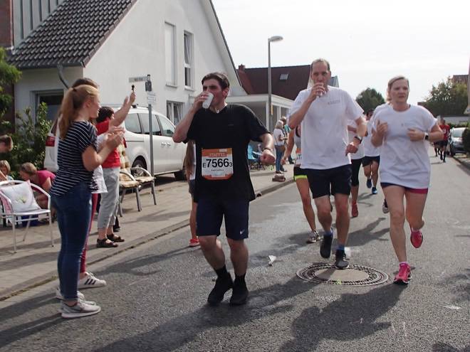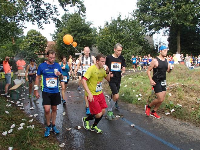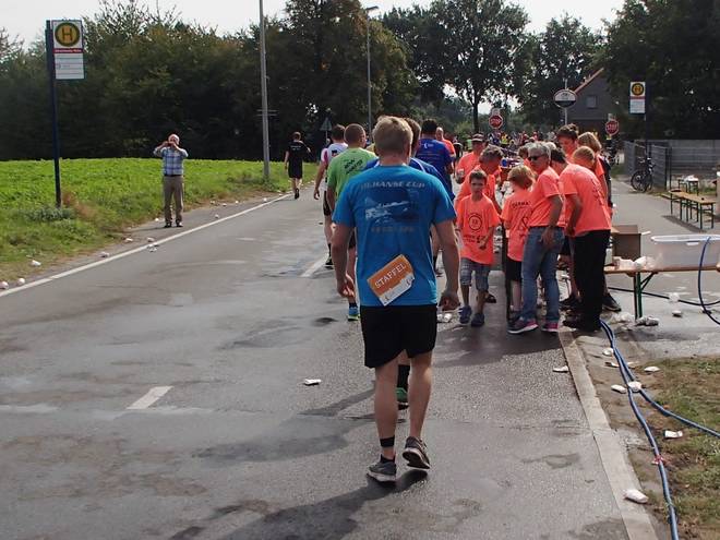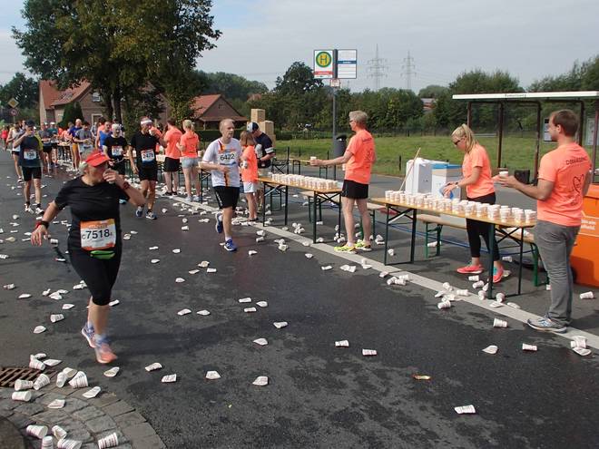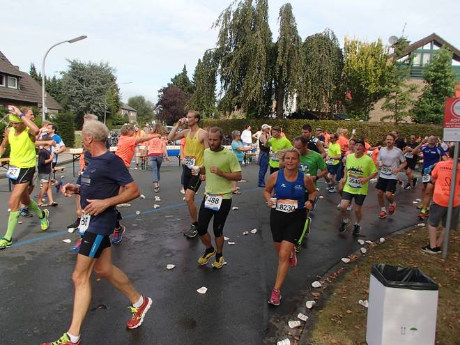 Roxeler Straße 12.04 Uhr - Km 32,5 Verpflegungsstand Dreizehn. Wasser in den Hals und über den Kopf und noch Wasser in den Hals. |