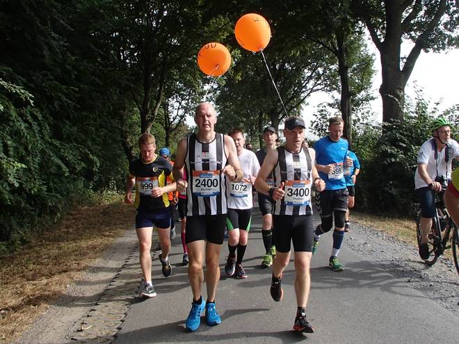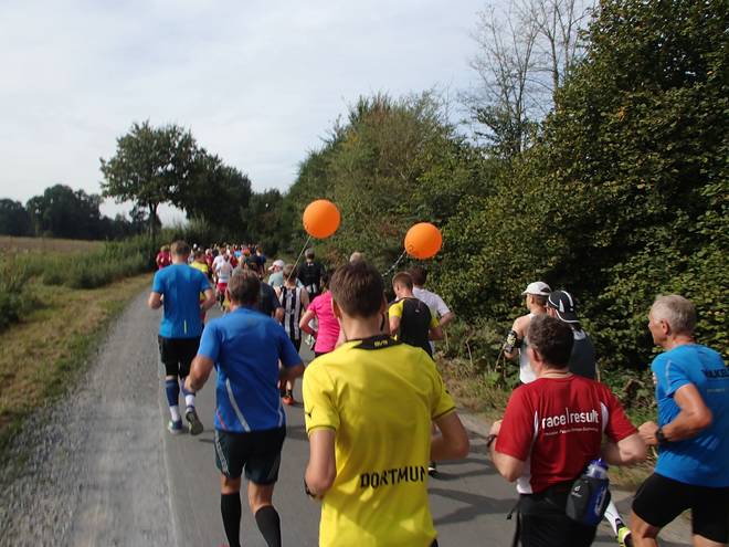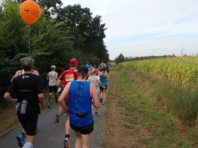 Stodtbrockweg 11.36 Uhr - Km 27,4 Die Musik motivierte mich zu einer kleinen Verschärfung des Tempos. Und schon war ich an den Vier-Stunden-Ballons vorbei gezogen. |