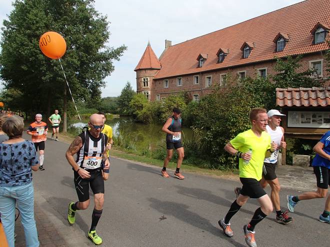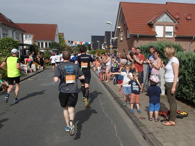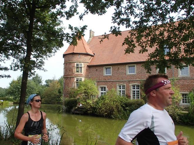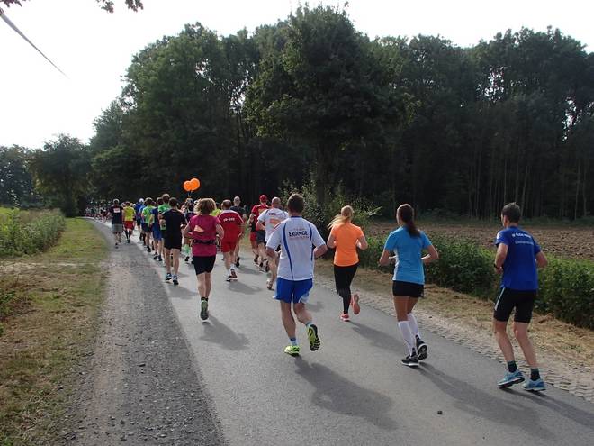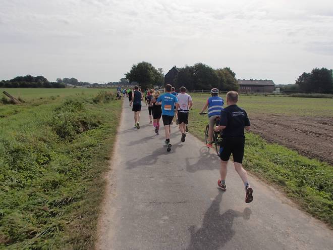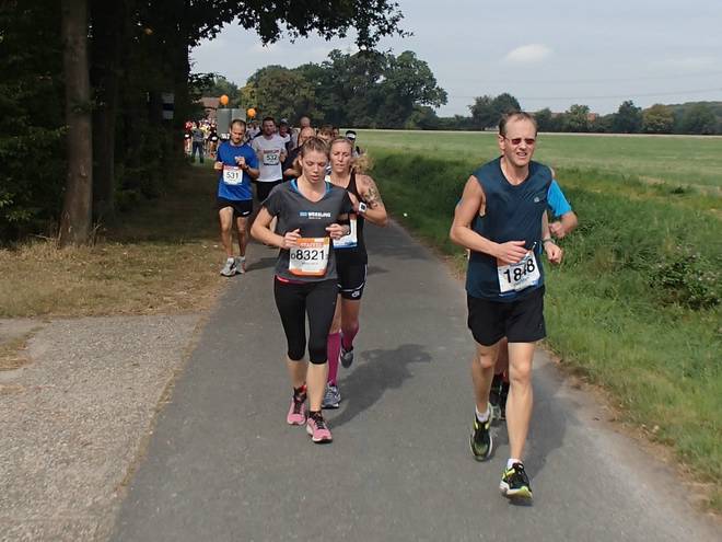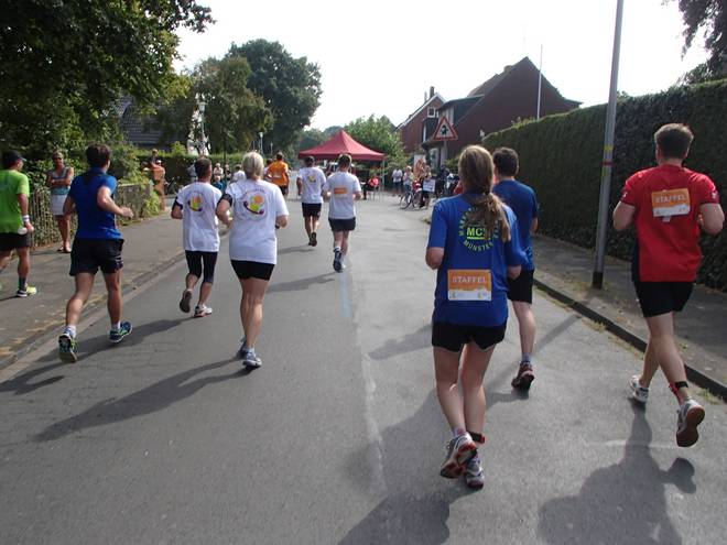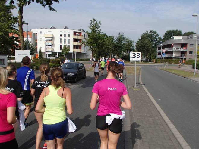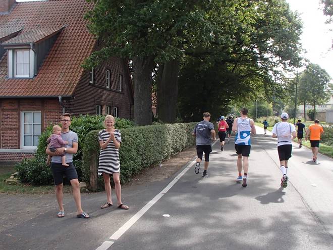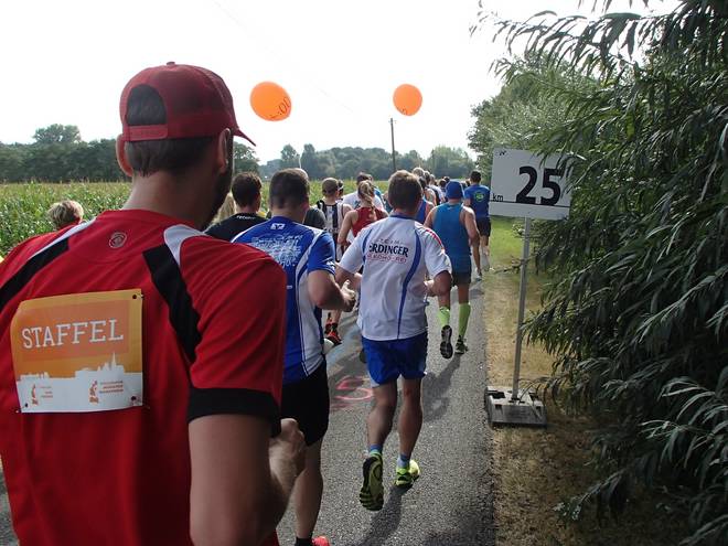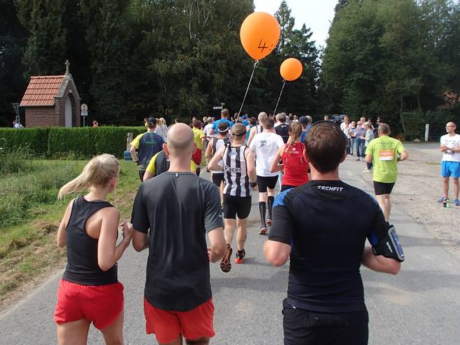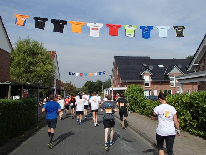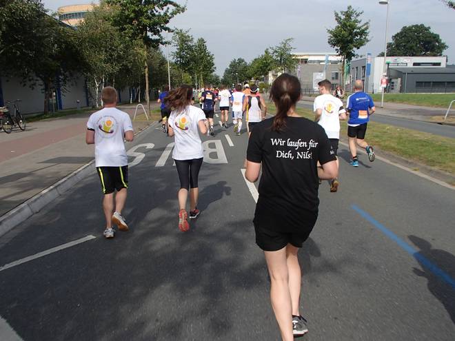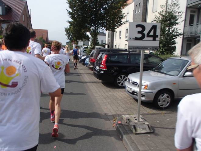 Borkenfeld 12.13 Uhr - Km 34,0 Die Läufer in Weiß waren für das Sorgentelefon Oskar des Bundesverband Kinderhospiz unterwegs. Ich lief den Tag mit dem "I run for life"-Shirt für das Kinder-Hospiz Sternenbrücke in Hamburg unterwegs. |