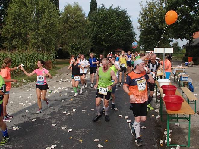 Haus Vögeding 11.26 Uhr - Km 25,3 Am Verpflegungsstand Zehn haute ich mir gleich drei Becher in den Hals. Trotzdem kam ich kurz vor den Ballo-Läufer. |