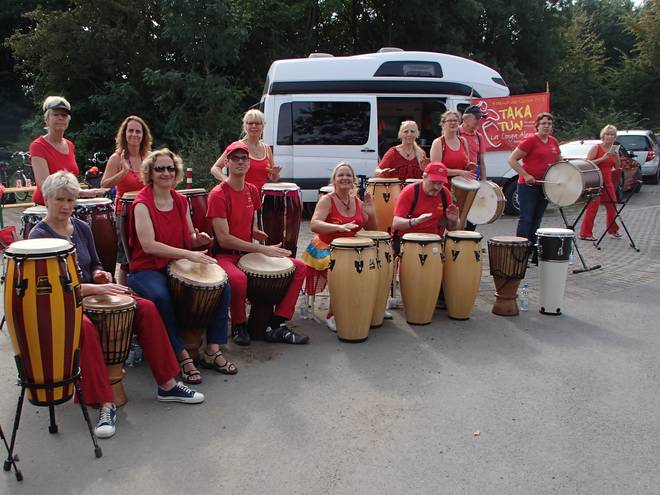 Twerenfeldweg 11.31 Uhr - Km 26,3 Auch auf dem Lande gibt es Musik. Eigentlich ja auch ganz praktisch. Hier kann man ja ungestört üben. Hier die afrokubanisxhe Trommelgruppe Taka Tun. |