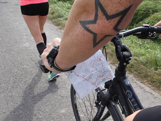 Stodtbrockweg 11.39 Uhr - Km 27,7 So ein mitfahrender Strecken-Plan hat schon war. Allerdings war der aktuelle Stand... äh... Laufpunkt verdeckt. Wir waren eher so da wo der Stern ist. |