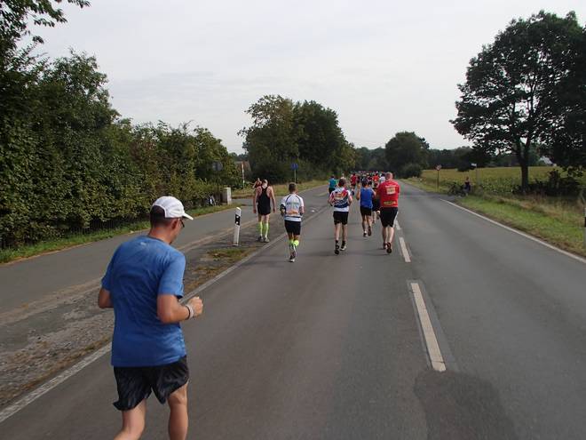 Stodtbrockweg 11.37 Uhr - Km 27,5 Die Offensive kurz vor dem Verpflegungsstand Elf war ein wenig dumm, denn natürlich wurde ich sogleich von der Gruppe wieder eingeholt. |
