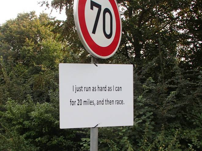 Rothenburg 12.57 Uhr - Km 42,0 "You are no longer a runner, YOU are a marathoner." Hübsches Schild, ich hätte "marathoner" aber auch in Großbuchstaben geschrieben. |