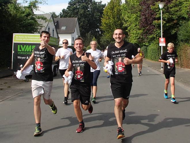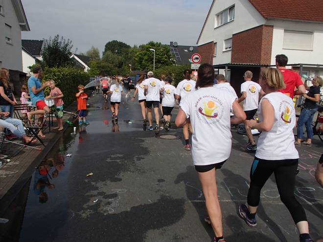 Nünningweg 12.20 Uhr - Km 35,3 Die Hospiz-Läufer mit den weißen Shirts waren offenbar dieselben, die auch in Schwarz mit "Wir laufen für Dich, Nils!" unterwegs waren (vorne: "Du bist überall, wo wir sind.") Immer mehr "Weiße" zogen die Shirts aus und liefen in Schwarz weiter. Die weißen Shirts lagen dann teilweise an der Straße herum. |