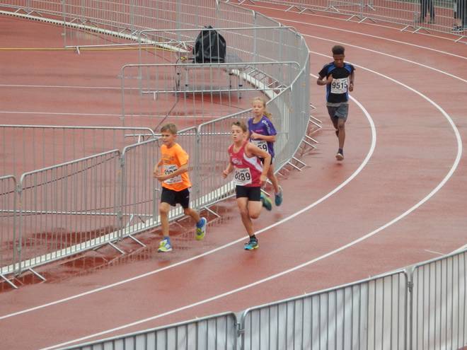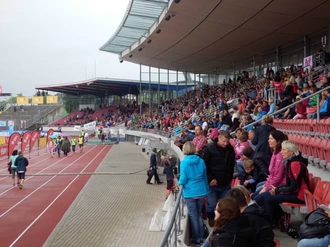 Auestadion 16.19 Uhr Die überdachten Tribünen waren immer noch gut besetzt. Es gab ja auch noch genug z gucken. Der letzte Läufer kam erst um 17.09 Uhr ins Ziel. Kinder-Läufe sind immer toll. Da steckt noch so die reine Leidenschaft drin, die vielen erwachsenen Läufern verloren gegangen ist. |