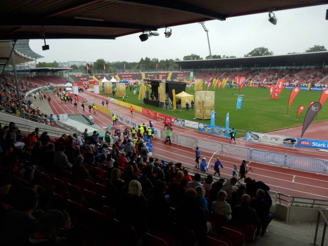 Auestadion 16.02 Uhr Und dann kam schon der erste Mini-Marathon-Läufer über die Bahn geflogen. |