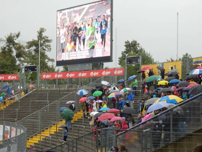 Auestadion 15.48 Uhr Da setzte ich mich doch lieber ins Stadion auf die trockne Tribüne und wartete auch die Läufer. |