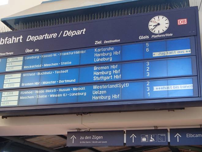 Bahnhof Hamburg-Harburg 8.38 Uhr Das fing ja gut an. Mein Zug fiel aus. Dabei hatte ich extra den früheren Zug gewählt, weil ich nicht erst fünf Minuten vor dem Start im Maschen sein wollte. |