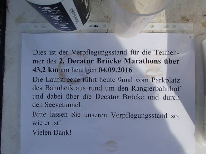 Bahnhof Maschen 14.52 Uhr Der Zug hatte zwar ein wenig Verspätung, aber ich kam am Ende doch noch rechtzeitig bei meiner Tochter an. Von der Decatur-Brücke würde in Kürze nichts mehr zu sehen sein. Bis zu einem möglich Neubau dürfte es dauern. Erst dann könnte man eine Neuauflage dieses Marathon in Planung nehmen. |