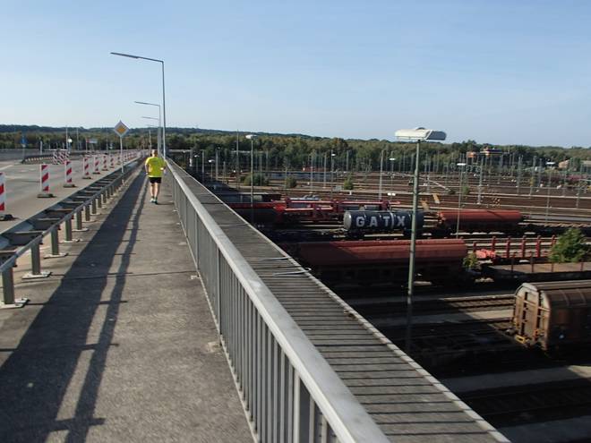 Decatur-Brücke Runde 4 11.43 Uhr / Km 14,8 Blick auf den Bahnhof Maschen. |