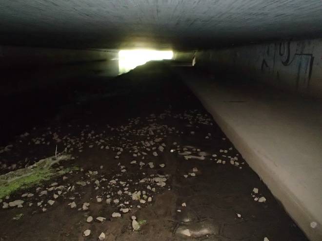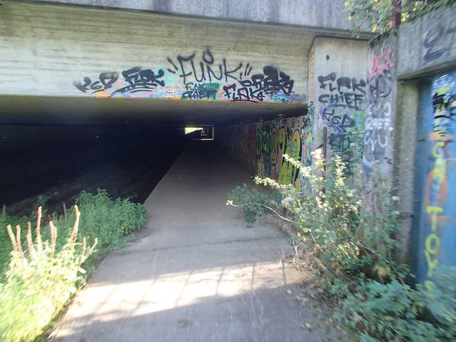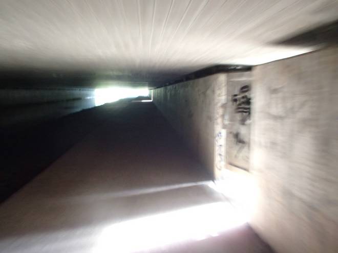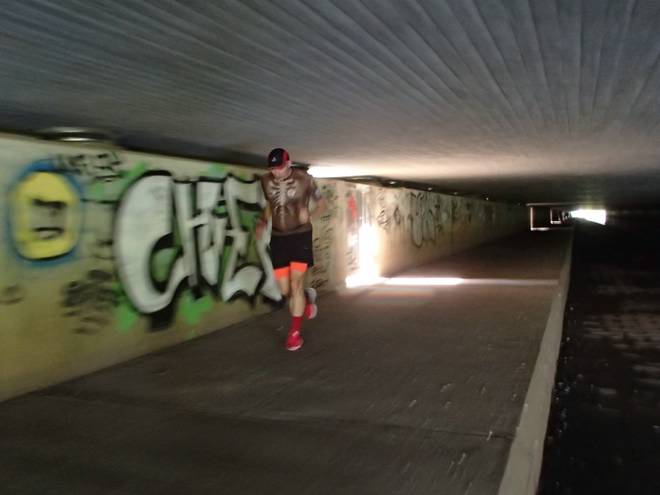 Seevetunnel Runde 7 13.22 Uhr / Km 32,4 Ich hätte einen Zollstock mitnehmen sollen. Dann hätte ich nachmessen können, wie hoch der Tunnel tatsächlich war. Aber auch ohne Laufschritt mindestens zehn Zentimeter zu niedrig für mich. |