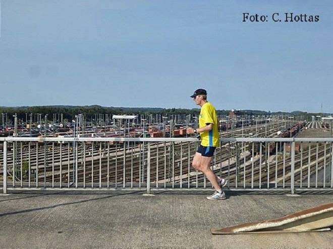 Bahnhof Maschen 10.19 Uhr Naja... es war nicht der Zweite seiner Art und es ging Rund um den Rangierbahnhof und nicht nur über die Brücke und es war schon 20 Tage später, aber die Anzahl der Runden und die Streckenlänge stimmte. Fast. Neun Runden zu jeweils 4798 Metern ergeben insgesamt 43,182 Kilometer. |
