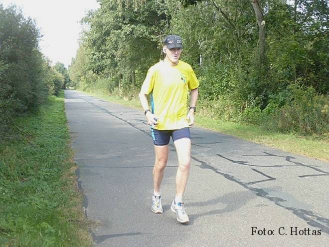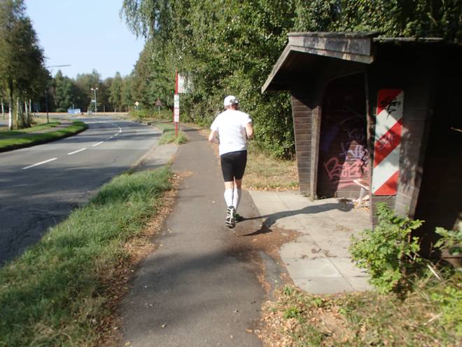 Hörstener Straße Runde 6 12.35 Uhr / Km 24,2 Wolfgang war mir 300 Meter voraus. Eine Weile hatte ich überlegt, ob ich ihn einholen sollte, aber das sparte ich mir. Er hatte wegen des späteren Starts ja noch elf Minuten zusätzlichen Vorsprung. Auch wenn das offiziell nicht zählt, ich wüßte es ja. Also beließ ich es bei Platz 3 und kümmerte mich weiter um die vier Stunden. |