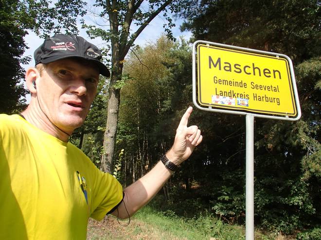 Maschener Schützenstraße Runde 9 14.06 Uhr / Km 40,4 Oft bekomme ich zum Ende eines Marathons nochmals neue Energie, aber davon spürte ich in Maschen nichts. |