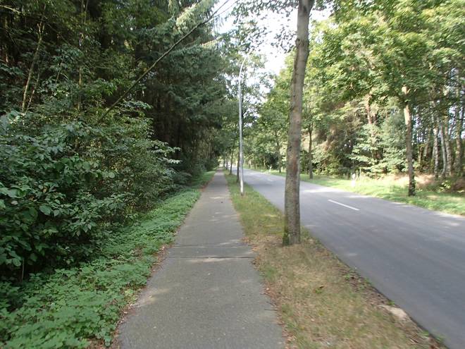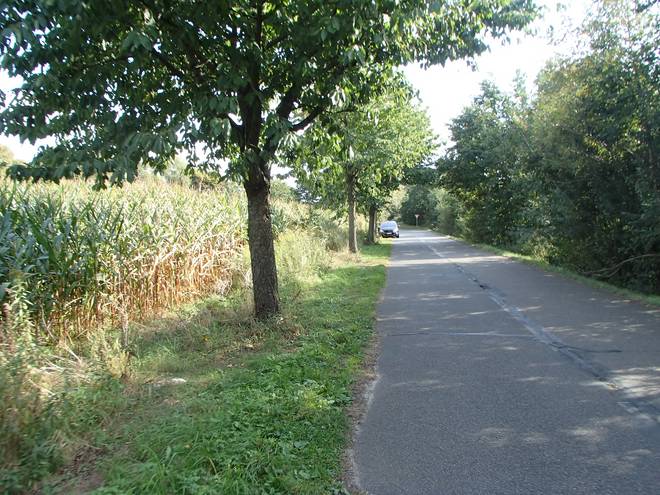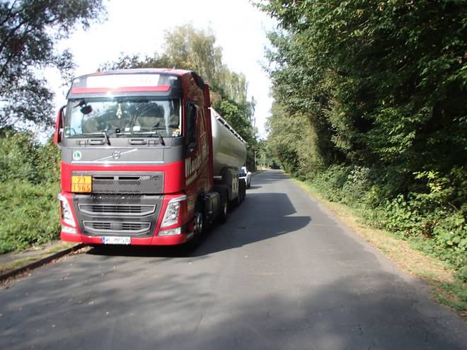 Alte Bahnhofstraße Runde 8 13.43 Uhr / Km 36,3 So lange kein Auto von vorne oder von hinten kam, störte der Tankwagen nicht. Der Fußweg links war mir aber zu schmal zum Laufen. |