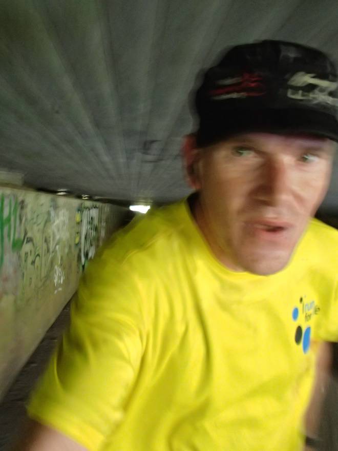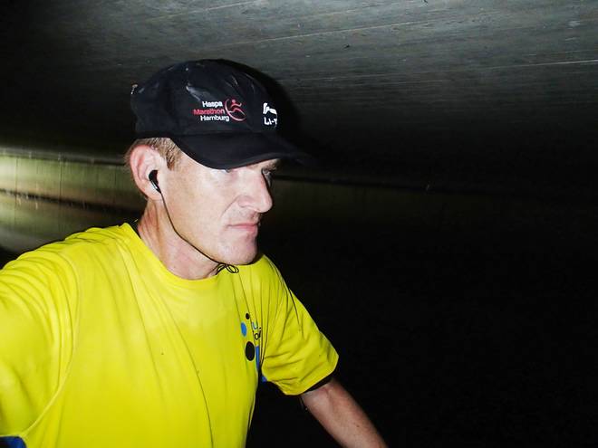 Seevetunnel Runde 3 11.32 Uhr / Km 12,9 Wie man sieht, kann Tobias hier am Anfang des Tunnels noch problemlos aufrecht laufen. |