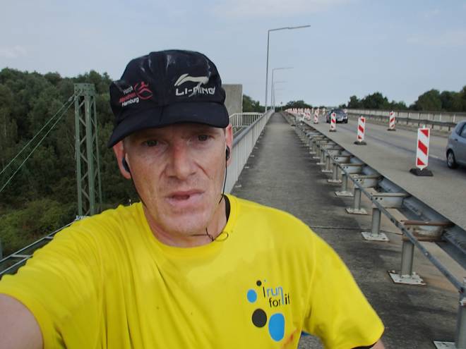 Decatur-Brücke Runde 5 12.11 Uhr / Km 19,8 Ich hatte Christian gar nicht gesehen, wie er Fotos von der anderen Brückenseite aus machte. Wie schon in Münster und Kassel hatte ich wieder das Hörbuch "Leuchtturmmord" von Katharina Peters dabei. Diesmal aber das Ende. Foto: Christian |