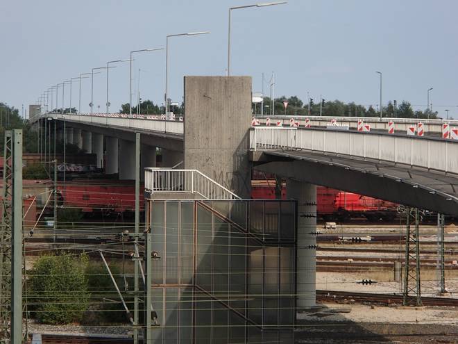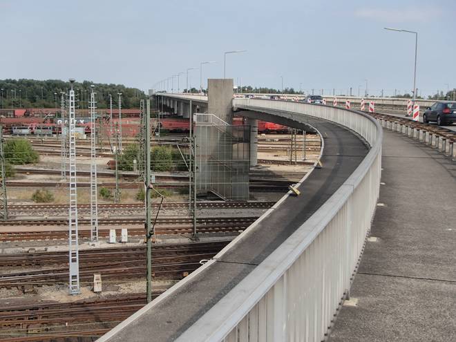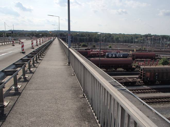 Decatur-Brücke Runde 1 10.26 Uhr / Km 0,8 Von hier oben hatte man einen schönen Blick über Europas größten Rangierbahnhof. Im Gegensatz zur Brücke sollte der über den 30. September erhalten bleiben. |