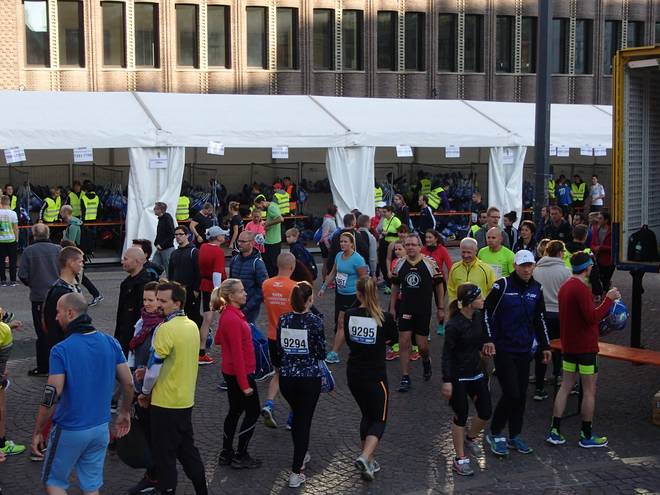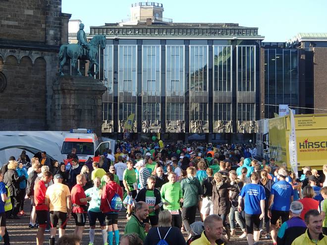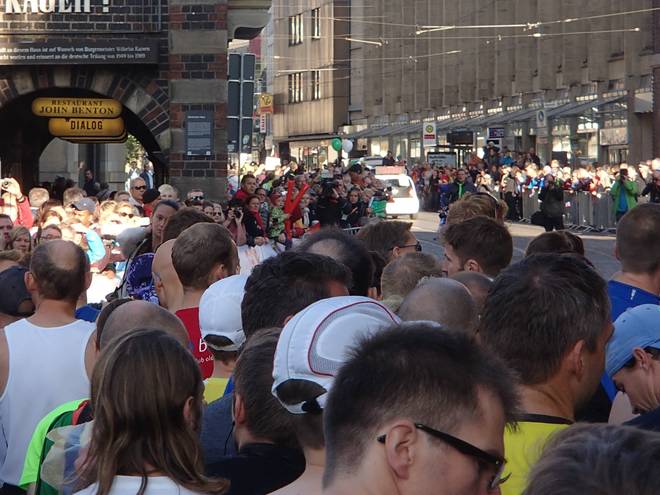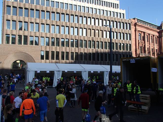 Domshof 8.21 Uhr 11°C, Sonne, blauer Himmel. Vielleicht ein kleines bisschen zu viel Wind, aber da will ich mich nicht beschweren. Zum Warten war es etwas kühl, aber ich würde mich schon bald warm laufen. Mehr als 16°C würden es nicht werden, also so betrachtet war alles hergerichtet für einen schnellen Lauf. |