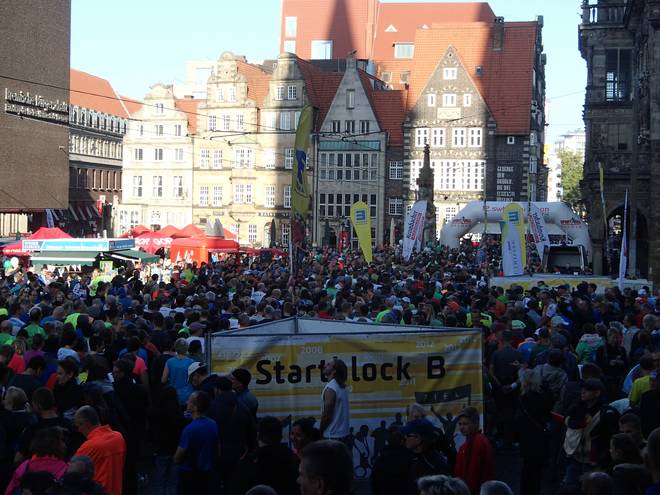 Am Markt Bremer Marktplatz 9.31 Uhr Noch ein paar mehr Läufer, nämlich 3434 starteten um 11.40 Uhr beim Halbmarathon. Um 11.10 Uhr gab es auch noch einen Kinderlauf. Allerdings ohne Wertung. Daher weiß ich auch nicht, wie viele Kinder mitgelaufen sind. Angemeldet waren 242. |