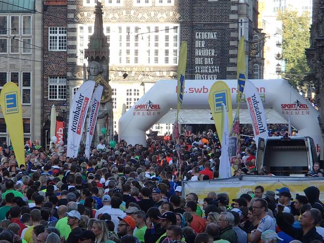 Am Markt Bremer Marktplatz 9.40 Uhr Zwischen Bremer Roland und Bremer Rathaus ertönte dann der Countdown und pünktlich um 9.40 Uhr ging der 12. swb- Marathon Bremen 2016 auf die Reise. |