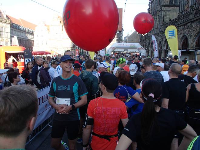 Am Markt Bremer Marktplatz 9.37 Uhr Jetzt immer schön mit den Ballons nach vorne drängeln. Da wollte mich auf Grund der 4:00:00 auf der Startnummer zwar nicht jeder sehen, aber das war mir egal. Als ich Ende 2015 angemeldet hatte, waren meiner Träume halt es wenig langsamer. |