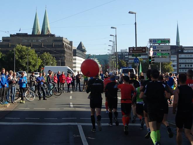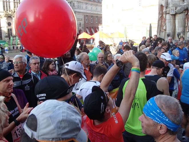 Am Markt Bremer Marktplatz 9.35 Uhr Nun wurde es auch für mich ernst. Die beiden 3:30-Stunden-Pacer zu finden war Dank der recht auffälligen Ballons problemlos. |