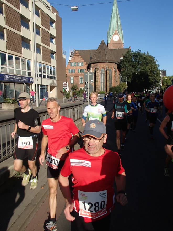 Martinistraße 9.46 Uhr / Km 1,1 Im Hintergrund steht die Sankt Martini Kirche. Wenn ich die wieder sehen würde, dann wäre ich bei Kilometer 42 schon vorbei. |