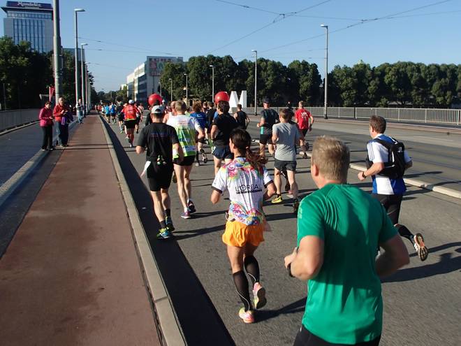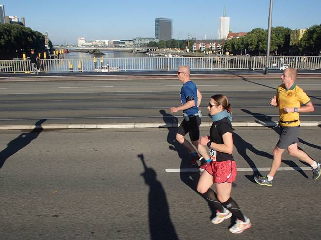 Bürgermeister-Smidt-Brücke 9.56 Uhr / Km 3,3 Über die Weser ging es aus dem Stadtzentrum raus. |