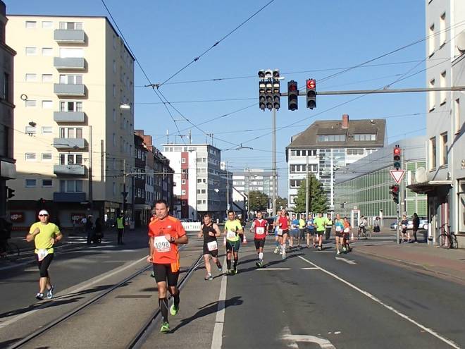 Wehrstraße 10.41 Uhr / Km 12,2 Prächtiges Wetter präsentierte man uns zum Marathon 2016 durch Bremen. Leicht windig, inzwischen wohl 12°C. Perfekt zum Laufen. Jetzt mußte ich es nur noch tun. Laufen. Und zwar schnell und noch rund 30 Kilometer. |