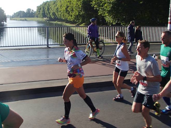 Wilhelm-Kaisen-Brücke 10.03 Uhr / Km 4,5 Zumindest halb. Nachdem wir die Kleine Weser überquert hatten, ging es rechts auf den Werder. |