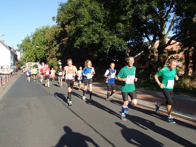Am Wall 9.52 Uhr / Km 2,4 Nachdem der Anfang recht gut verlaufen und mir das Tempo gar nicht so hart vorgekommen war, wurde es an den etwas welligen Wallanlagen doch schwieriger. |