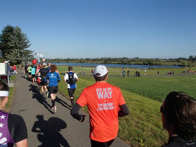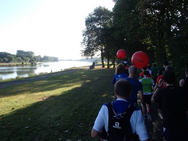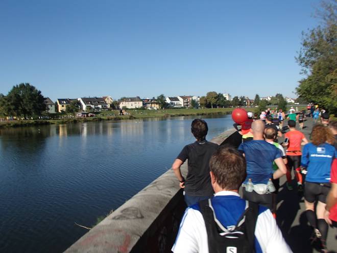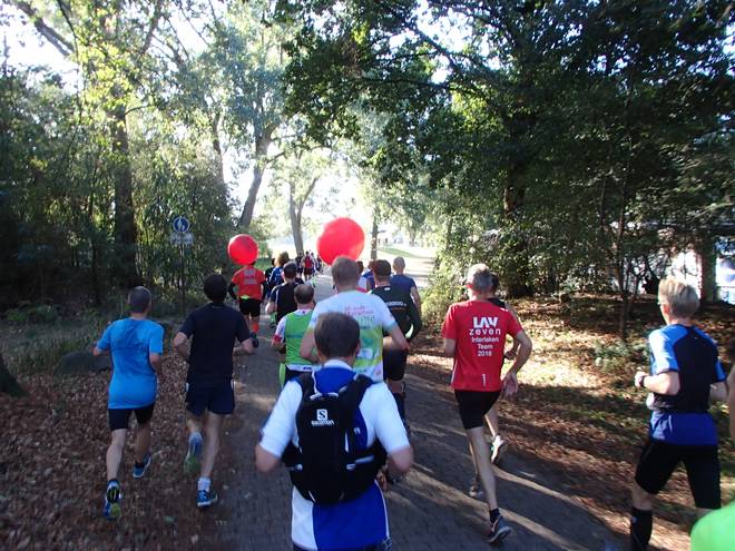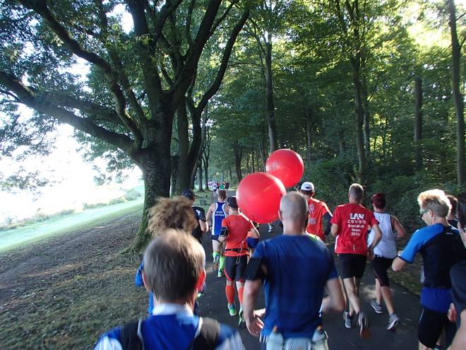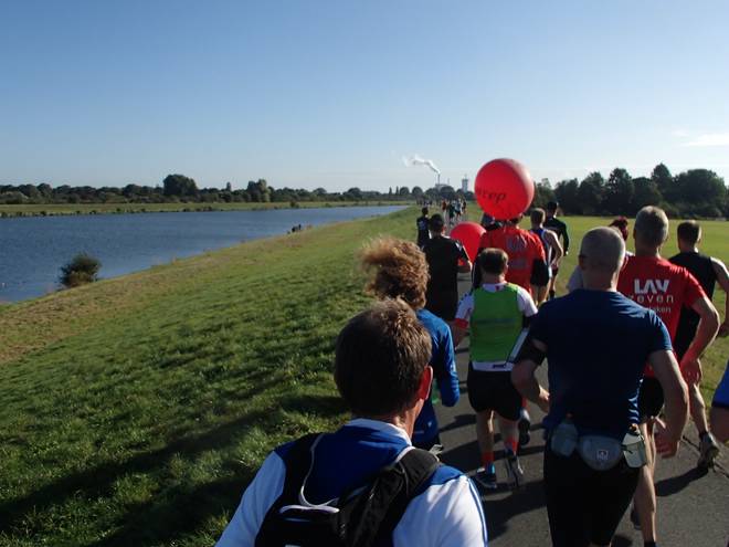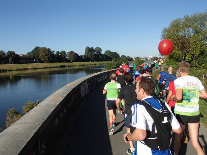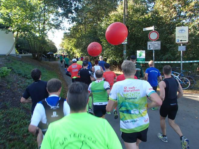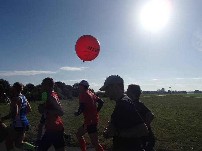 Weserdeich 10.20 Uhr / Km 8,0 Hinter den Ballon-Läufern ist es immer recht vol. Eine Gruppe rennt genug unter den Ballons mit, eine zweite Gruppe folgte mit ein paar Metern Abstand. |