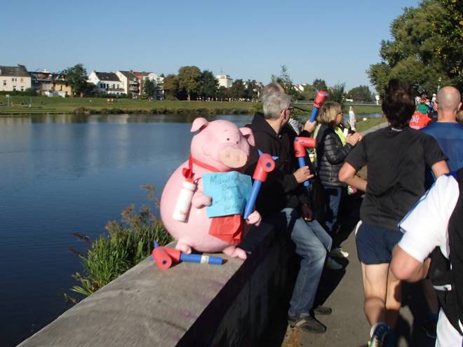 Am Werdersee 10.16 Uhr / Km 7,1 Das Schwein wünscht uns vier Erfolg. Aber ich konnte nicht erkennen von wem. |