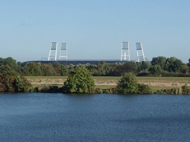 Weserdeich 10.26 Uhr / Km 9,4 Das Weserstadion. Aaaahh!!! Wenn man einmal vom Ziel absieht das Highlight dieses Marathons. Da würden wir allerdings erst nach Kilometer 38 durchlaufen. |
