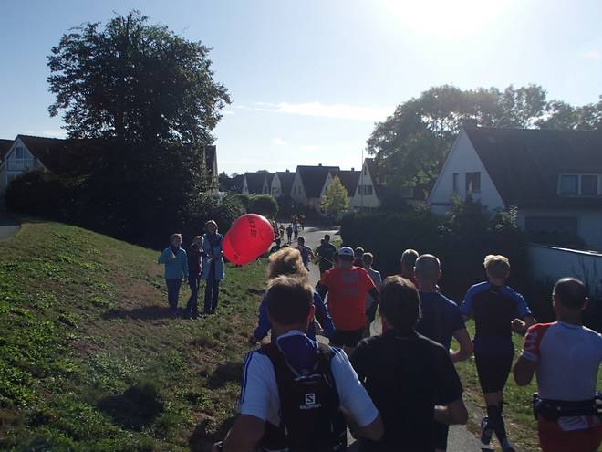 Weserdeich 10.20 Uhr / Km 8,1 Nun ja... bei den doch ziemlich großen Ballons war Abstand keine dumme Idee. Wer zu nah dran lief, bekam die Ballons durchaus auch mal gegen den Kopf. Wind ist unkontrollierbar. |