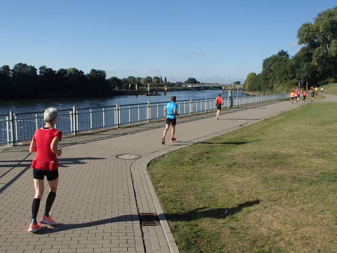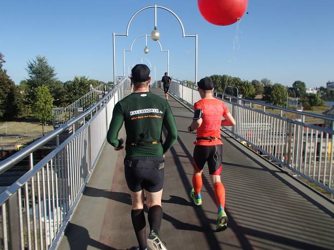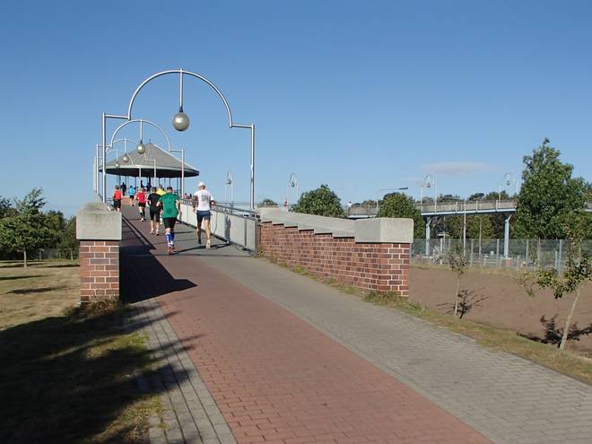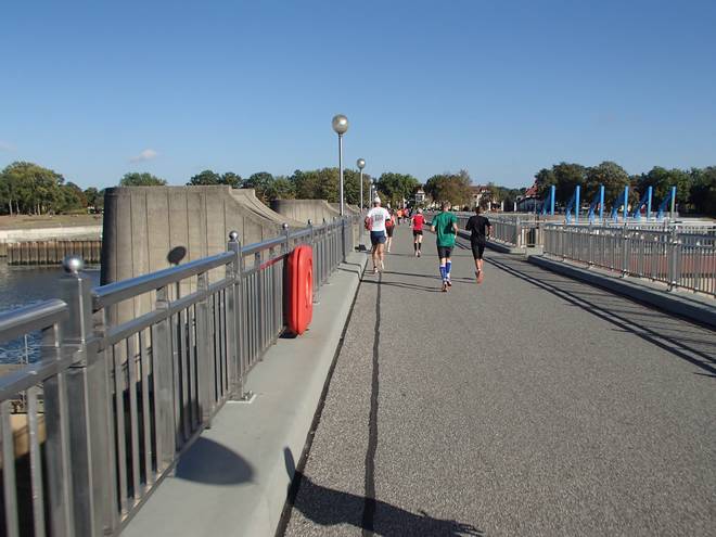 Weserwehr 10.46 Uhr / Km 13,3 Der Bremen-Marathon hat nicht allzu viele Höhenmeter. Dafür bietet er ein paar fiese Unterführungen. Und über das Weserwehr muß man. |