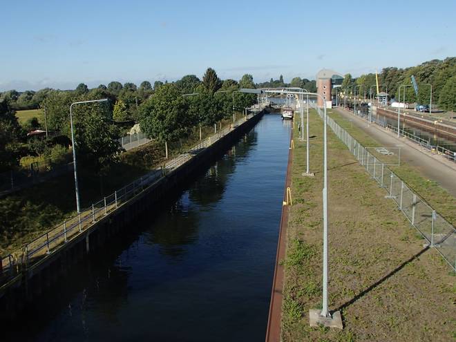 Weserwehr 10.46 Uhr / Km 13,4 Das Schleusenbecken, um die Weser schiffbar zu halten. |