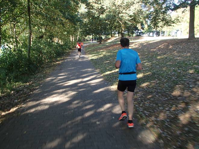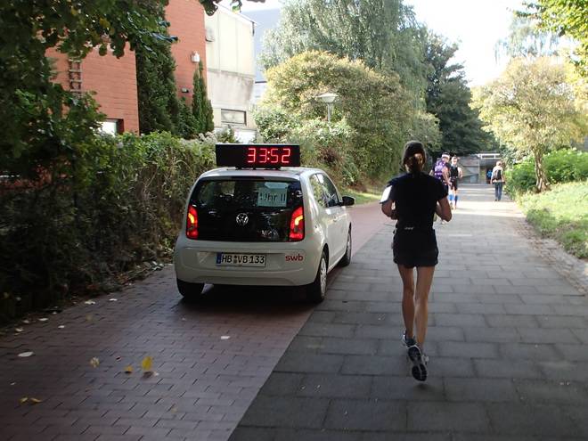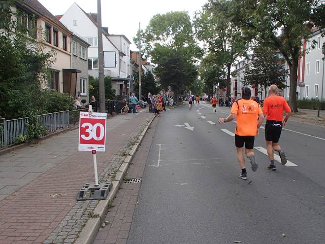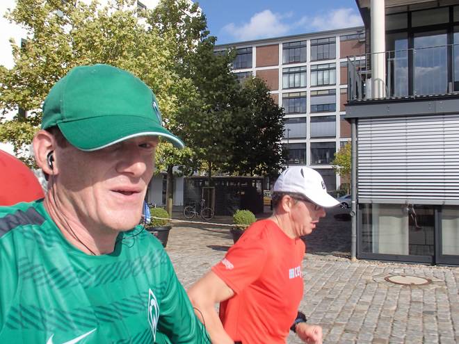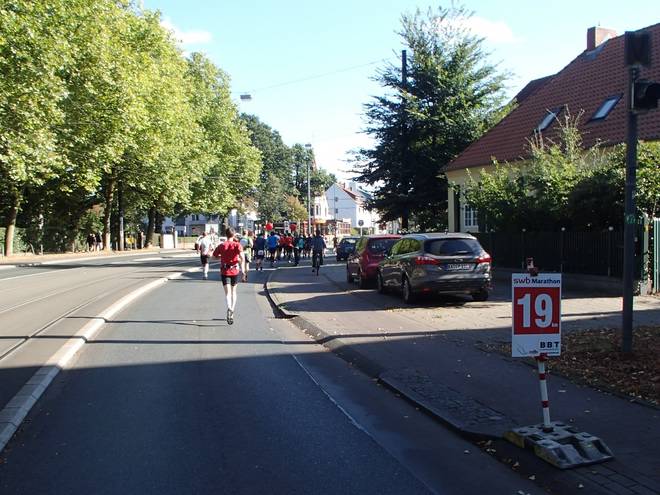 Schwachhauser Heerstraße 11.14 Uhr / Km 19,0 Mit etwas Geduld klappte es mit dem Aufholen ganz gut. Zwei flotte 80'er-Jahre-Songs auf dem mp3-Player und ich kam näher und näher. |