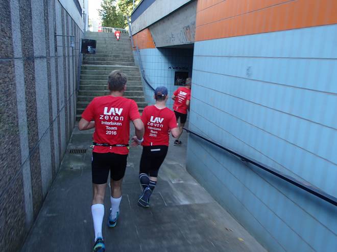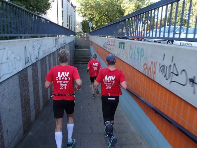 Kurfürstenallee 11.07 Uhr / Km 17,7 Dieses Runter und Rauf mit den engen Kurven (Achtung Gefahr Kachelnklatschen) bringt so richtig schön den Laufrhythmus durcheinander. |