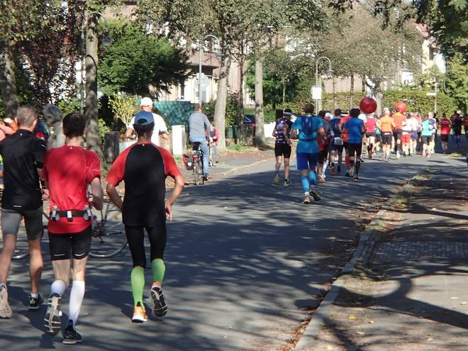 Parkallee 11.52 Uhr / Km 27,0 So lange die Gruppe zusammen hielt konnte man auf weitere Tempo-Macher verzichten, aber es würde nicht lustig werden, demnächst von der sehr schnellen Halbmarathon-Spitze überrannt zu werden. |
