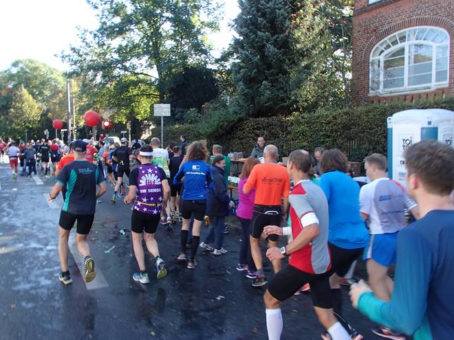 Anne-Conway-Straße 11.38 Uhr / Km 24,0 Erst hatte ich schmerzbedingt am kleinen Hügel am Ende des Herzogenkamps den Anschluß verloren, dann etwas wieder aufgeholt und beim Trinken wieder verloren. Das Aufholen fiel nun deutlich schwerer als bei Kilometer 18 bis 19. Aber ich kam wieder ran. |