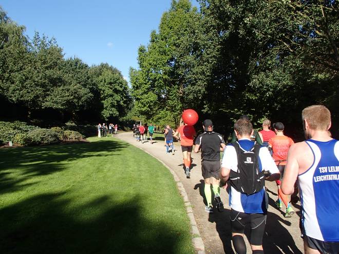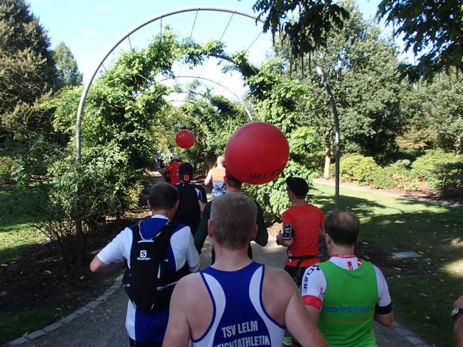Rhododendronpark 11.24 Uhr / Km 21,4 Die Gruppe hinter den Ballons war etwas kleiner geworden, aber als es am Eingang des Parks schmaler wurde, mußte man sich doch neu sortieren. |